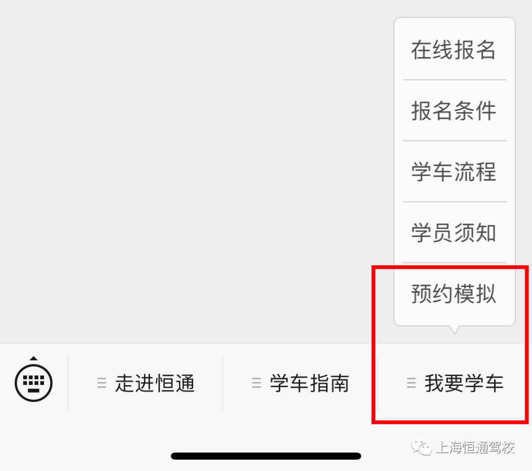 在哪约 学员可进入我校微信公众号“上海恒通驾校”点击菜单“我要学车”菜单选择“预约模拟”。